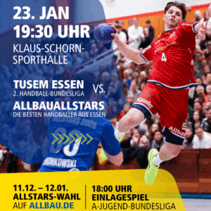 AllbauAllstars 2026 Wie auch in den letzten findet am 23. Januar wieder das Allbau-Allstar -Spiel für den gemeinnützigen Zweck statt.Dort tritt eine Auswahl von Handballern aus Essen
