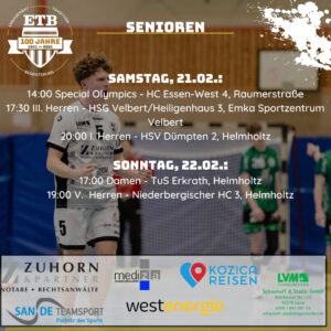 Einladung zur Jahreshauptversammlung 2026 Die ETB-Handballabteilung lädt ein zur Jahreshauptversammlung 2026 am Freitag, 20.03.2026, um 19.00 Uhrim Vorraum der Helmholtzhalle, Rosastraße 83, 45130 Essen. Die vollständige Einladung