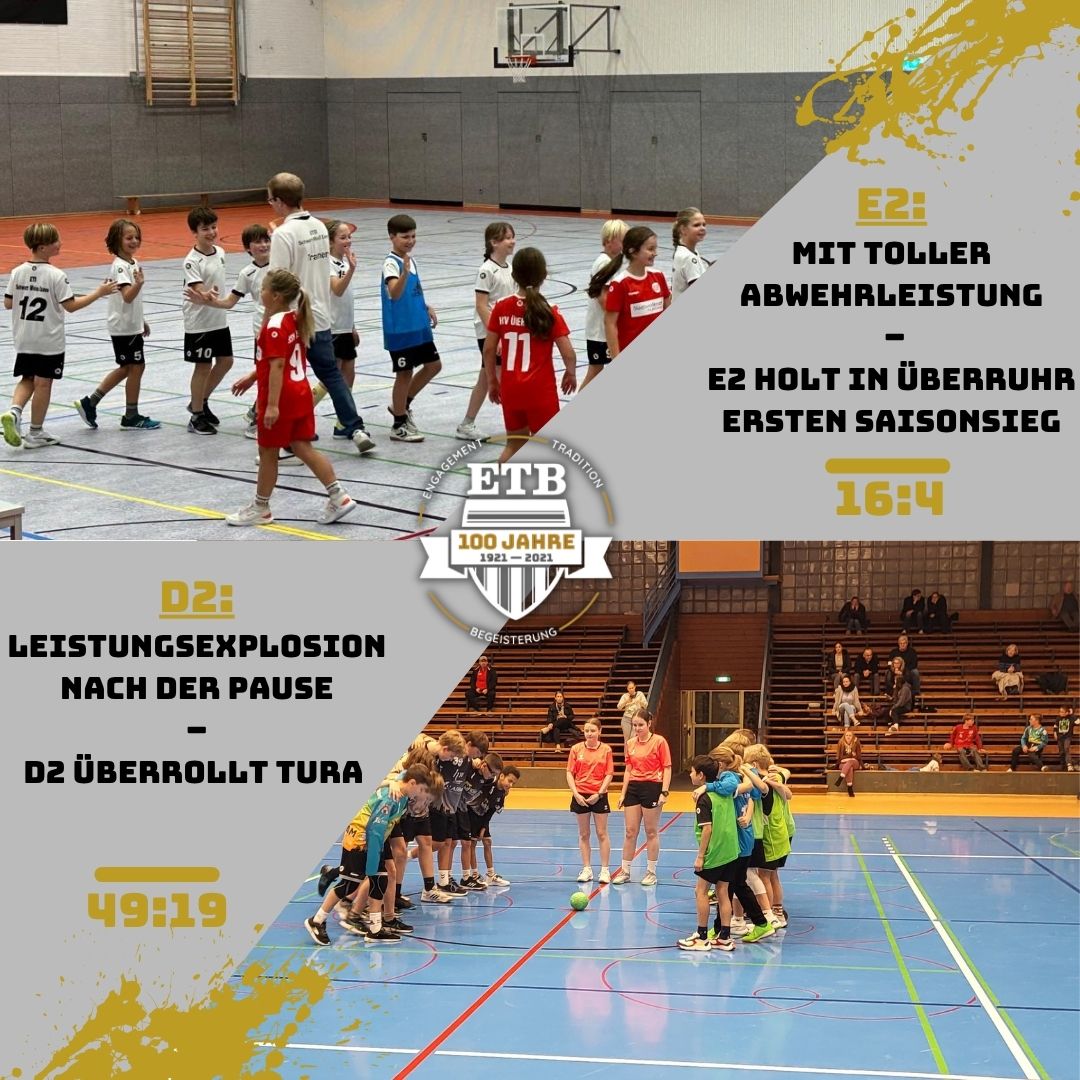 Im zweiten Spiel feiert unsere E2 ihren ersten Saisonsieg. Bei der Mädchenmannschaft von Überruhr begann unser Team noch sichtlich nervös, verlor im Aufbau und beim Torabschluss viele Bälle und führte nach neun Minuten nur mit 1:0. Die ETB-Deckung erwischte dagegen einen sehr guten Start, konnte die Passwege gut zustellen und kam – auch durch zahlreiche Paraden von Milan Graszk im ETB-Tor – zu vielen Ballgewinnen. Das gute Niveau der zweiten 10 Minuten konnte im 6 gegen 6 nicht ganz gehalten werden, wobei die Abwehr nach wie vor wenig zuließ. Offensiv lief es wieder schleppender durch viele falsche Wurfentscheidungen und Ungenauigkeiten im Abschluss. Verlassen konnte sich die Mannschaft auf die Treffsicherheit von Henri Heitmann. Ein verdienter und ungefährdeter 16:4 Erfolg für unsere E2. Jakob Dannemann erzielte seine ersten Tore für den ETB.