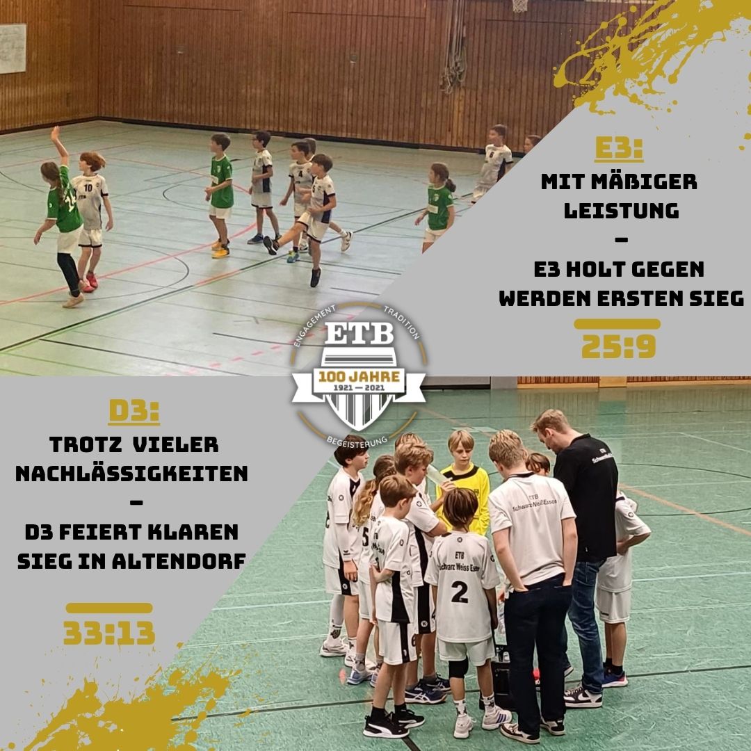 Nach zwei hohen Niederlagen zum Auftakt holt unsere E3 im Spiel gegen Werden ihren ersten Saisonsieg. Klar überlegen war unsere Jungjahrgangsmannschaft im 3 gegen 3. Der Angriff kam gut ins Tempospiel und vor allem Max Himmerich war nicht zu stoppen und erzielte die ersten sechs Tore zum schnellen 6:0. Die Abwehr war dagegen nicht ganz auf der Höhe und verlor zu oft die Zuordnung. Immer wieder tauchten die Gegenspieler frei vor dem ETB-Tor auf, doch Jacob Fendler stand im Tor fast immer im Weg. Die deutlichen 18:4 Pausenführung folgerichtig. Im zweiten Durchgang die gewohnten Fehler auf dem großen Feld: Der Angriff agierte extrem statisch, Bewegung ohne Ball fehlte fast völlig, was zu vielen Abspielfehlern und unzähligen Fehlwürfen führte. So gelangen nur noch sieben eigene Treffer, die letzten 10 Minuten blieb unsere E3 gar ganz torlos. Der Harmlosigkeit des Gegners war es zu verdanken, dass der klare Heimsieg nie in Gefahr geriet.