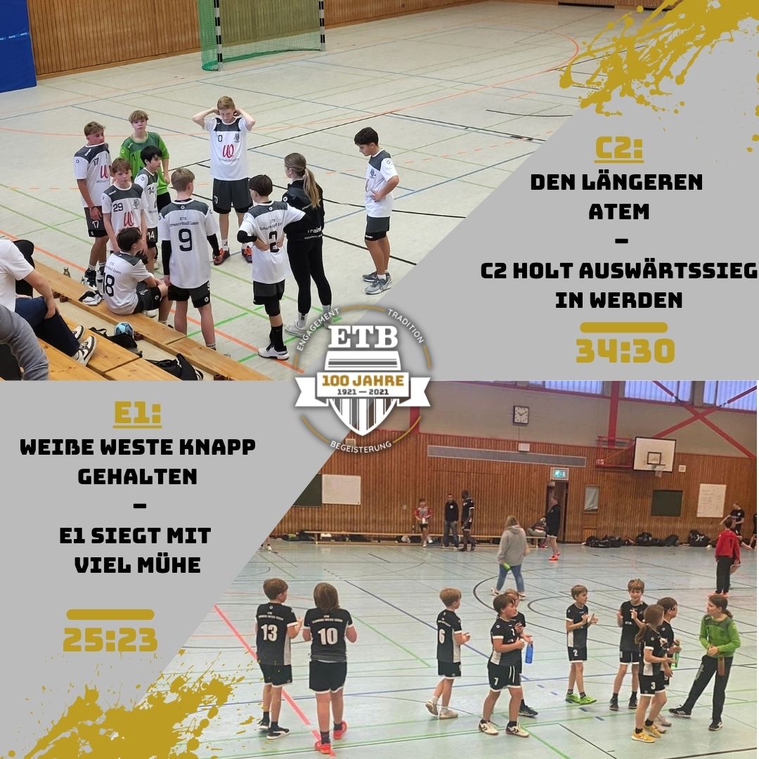 Unsere C2 fährt im Derby in Werden ihren vierten Sieg ein und erobert Tabellenplatz drei. In einer fehleranfälligen Anfangsphase auf beiden Seiten konnte sich zunächst keine Mannschaft absetzen. Mit zunehmender Spieldauer wurde der Angriff in seinen Aktionen zielstrebiger, wenngleich sich immer wieder schwache Zuspiele vor allem zum Kreis einschlichen. Die Abwehr zwang den Gegner zu schwierigen Würfen, die dann häufig vom starken Torwart Frederik Actun pariert werden konnten, unserer Mannschaft fehlten aber einfache Ballgewinne – 16:13 die Führung zur Pause. Ähnliches Bild auch im zweiten Durchgang; die Deckung im Zweikampf gegen die beiden mit zusammen 24 Toren einzig gefährlichen Werdener zu zaghaft, die Fehler der Gastgeber reichten aber, um sich mit besserem Angriffsspiel um den mit 18 Toren überragenden Mikkel Stenzel nach 32 Minuten auf 24:18 abzusetzen. Erst in den Schlussminuten stieg die Fehlerzahl wieder an, sodass Werden verkürzen konnten – in Gefahr geriet der verdiente Auswärtssieg aber nicht mehr.