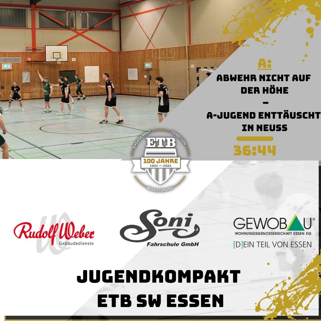 Es bleibt weiterhin nicht die Saison unserer A-Jugend, die auch bei den bis dahin sieglosen Neussern den Kürzeren zieht. Personell einmal mehr arg gebeutelt, musste man mit nur einer Wechseloption die Reise nach Neuss antreten. Nach 1:0 Führung geriet unsere Mannschaft schnell deutlich in Rückstand; die ETB-Abwehr nicht auf der Höhe des Geschehens: Gegen einen spielerisch nicht sonderlich starken Gegner kamen unsere Jungs fast immer einen Schritt zu spät oder konnten das Zusammenspiel mit dem Kreisläufer nicht unterbinden. Da es auch im Rückzug haperte, stand es nach 25 Minuten bereits 13:25 gegen unsere A-Jugend. Offensiv war der Mannschaft dagegen weniger vorzuwerfen; gerade im Tempospiel unter der Regie von Joris Röder fand man verlässlich gute Lösungen; wenngleich die Chancenverwertung gegen einen starken Neusser Torwart ausbaufähig blieb – allein vier Siebenmeter wurden vergeben. Die zweite Hälfte ging knapp mit 18:17 an unsere Jungs – bei allerdings entschiedenem Spielstand. Hier wäre deutlich mehr möglich gewesen als die 36:44 Niederlage.