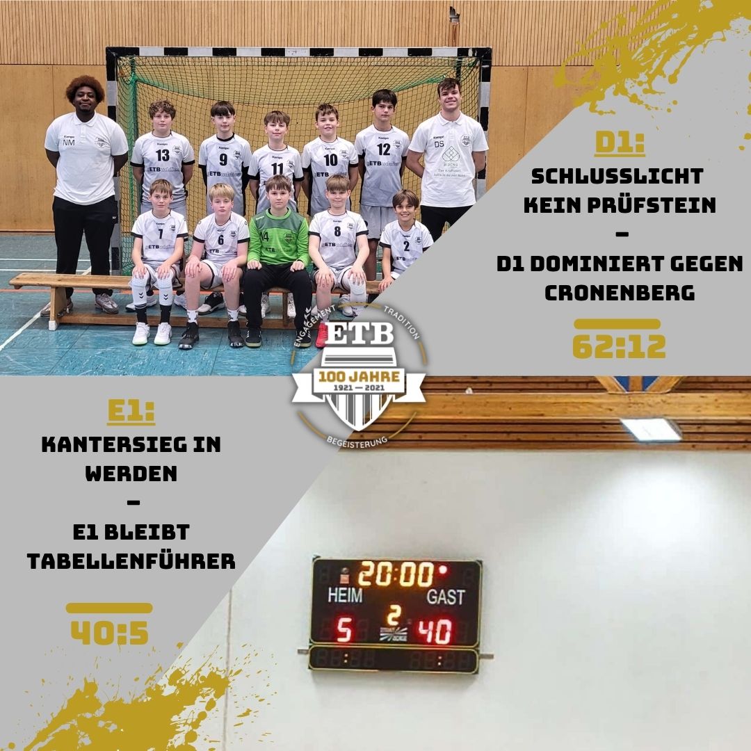 Für unsere D1 war das punktlose Schlusslicht aus Wuppertal-Cronenberg wie erwartet kein Prüfstein – zu überlegen unsere Jungs in allen Belangen. Der jüngere Gegner konnte die offensive ETB-Abwehr nur selten überspielen, viele Bälle wurden früh erobert und dann mit Gegenstößen verwertet – nach fünf Minuten die erste Auszeit der Gäste beim Stand von 10:1. Mit gleichem Tempo ging es durch die weitere Partie; trotz Rotation konnte der Vorsprung kontinuierlich ausgebaut werden. Über den Halbzeitstand von 31:4 endete die einseitige Partie 62:12 – Kempator inklusive.