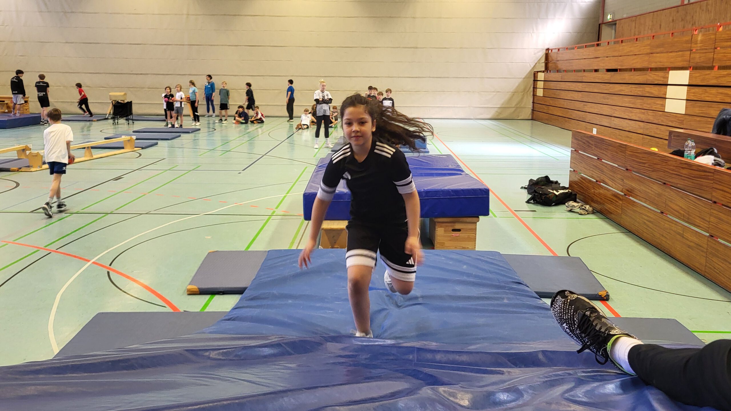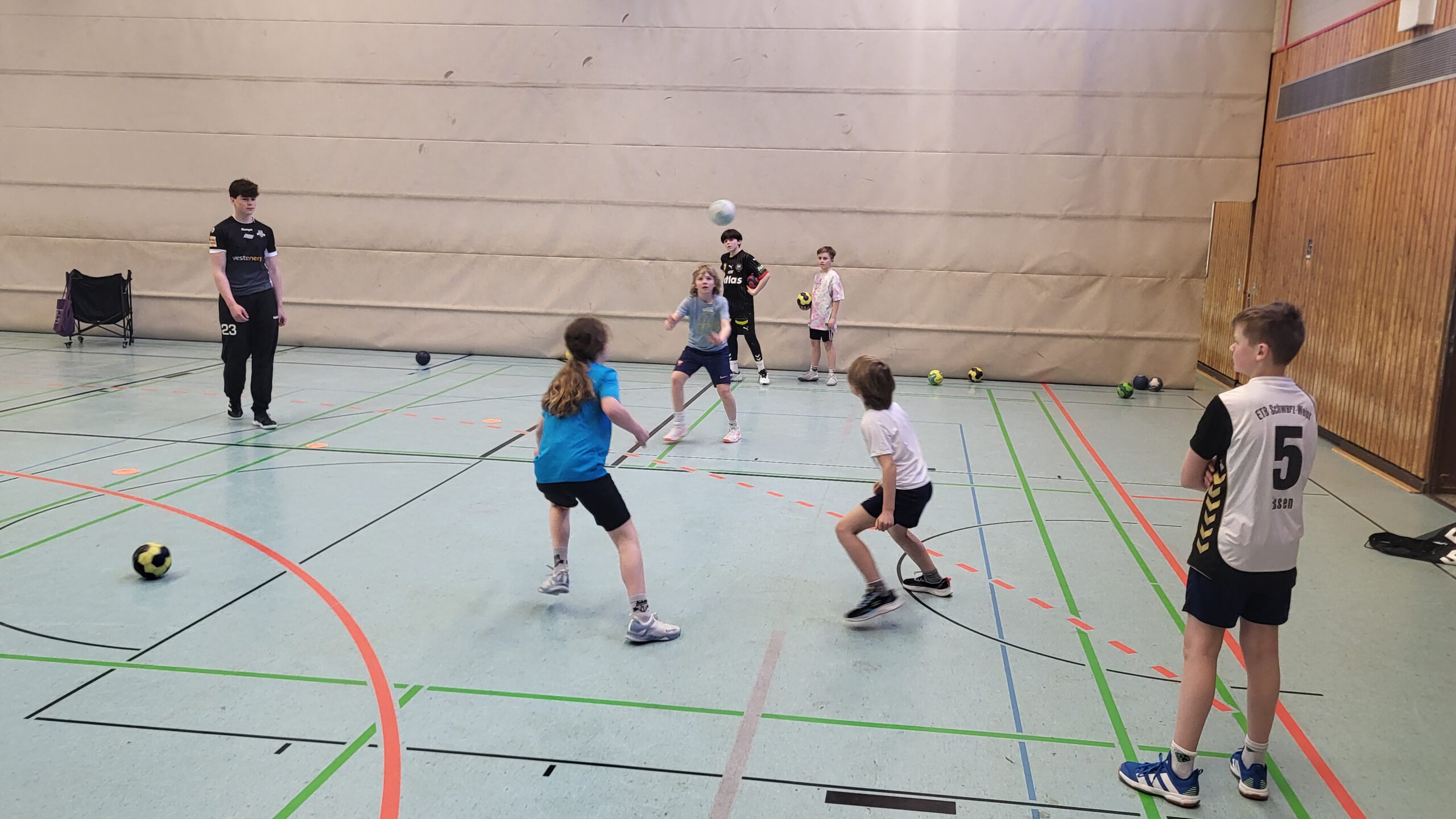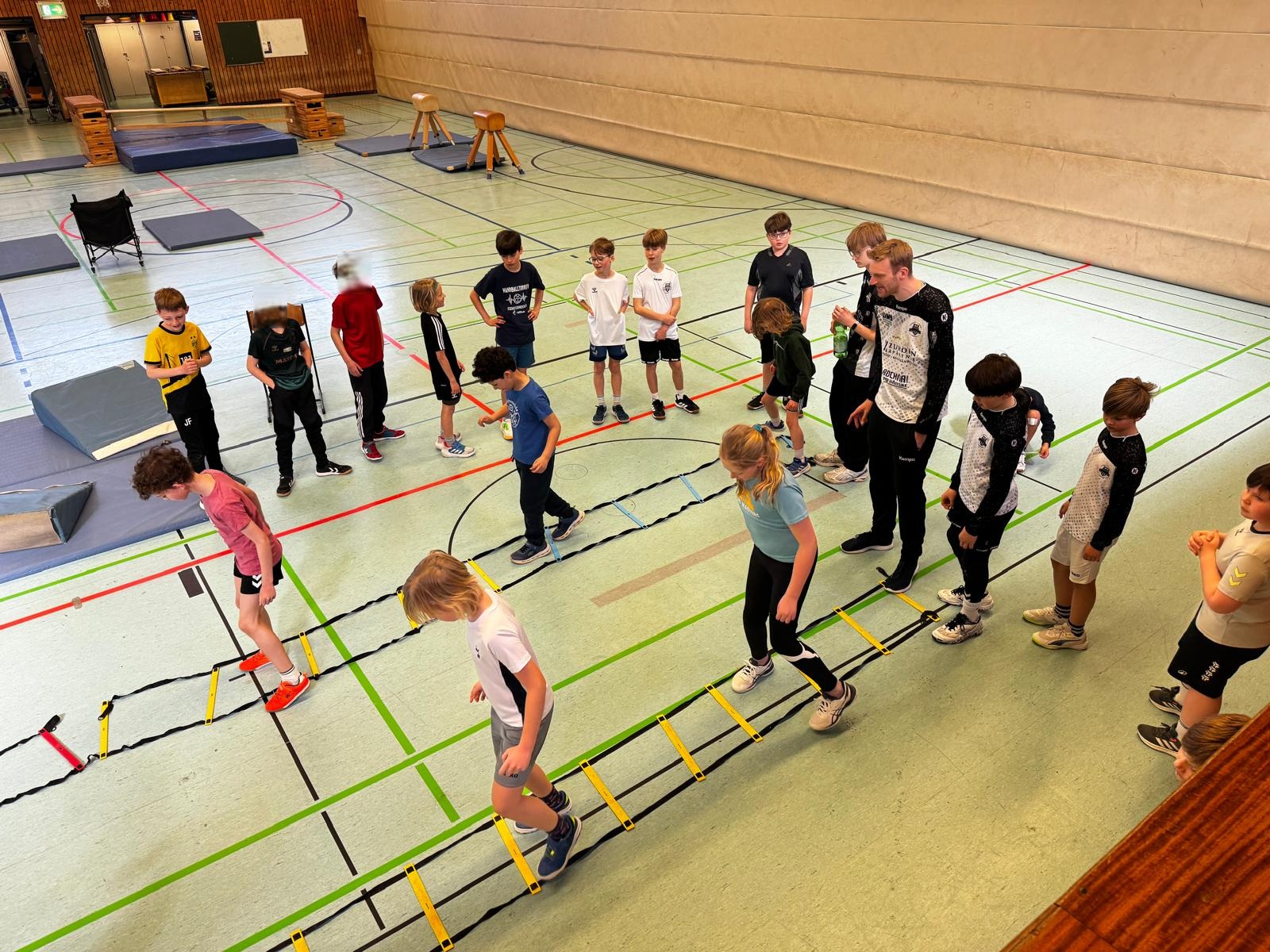 So hatte das Trainerteam, das diesmal aus elf Trainerinnen und Trainern aus dem D-, E- und F-Jugend-Bereich bestand (Rekord), alle Hände voll zu tun, die Kinder in drei Gruppen in der Helmholtz-Halle zu beschäftigen.